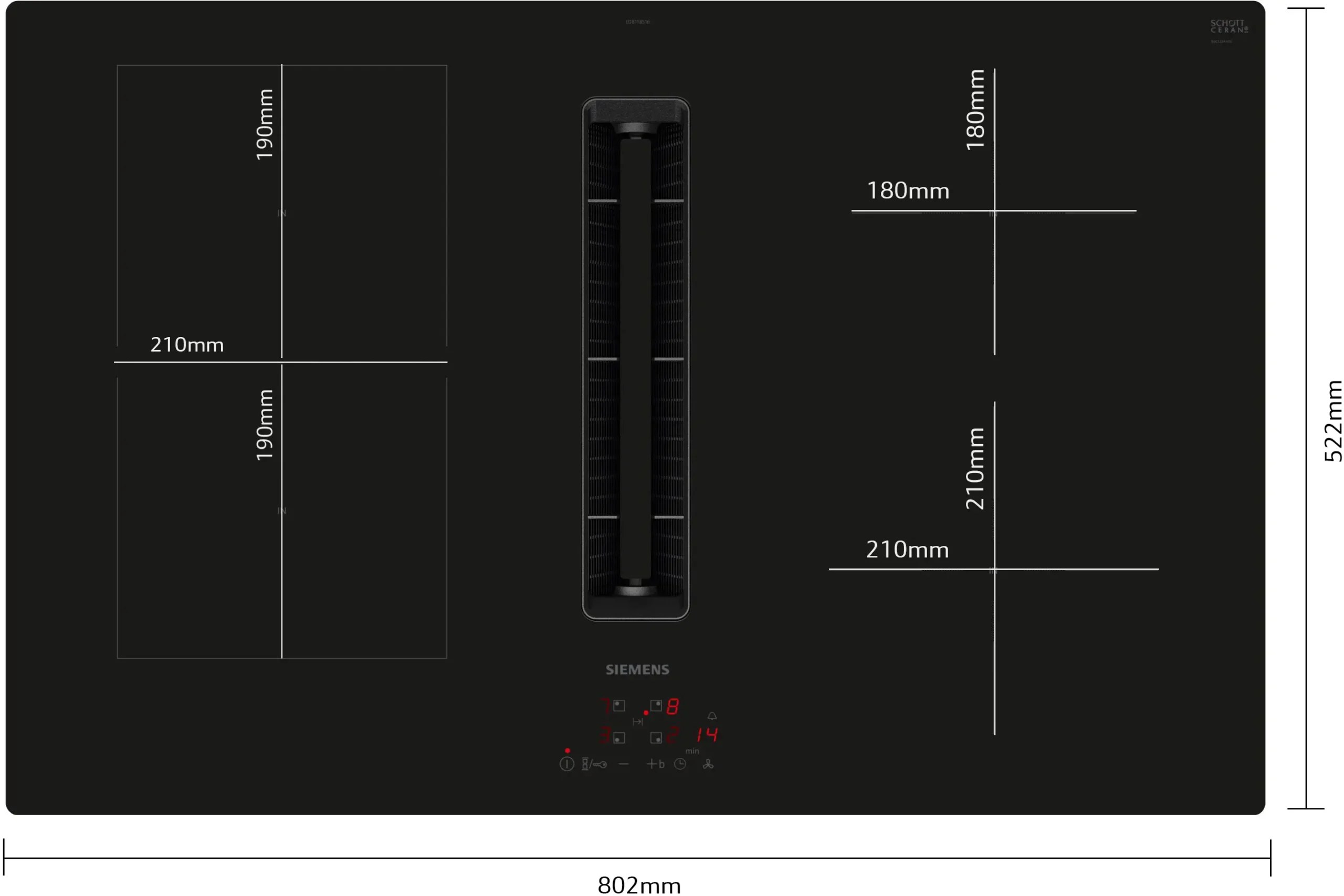 • Kochzone vorne links: 190 mm, 210 mm, 2.2 kW (maximale Leistung