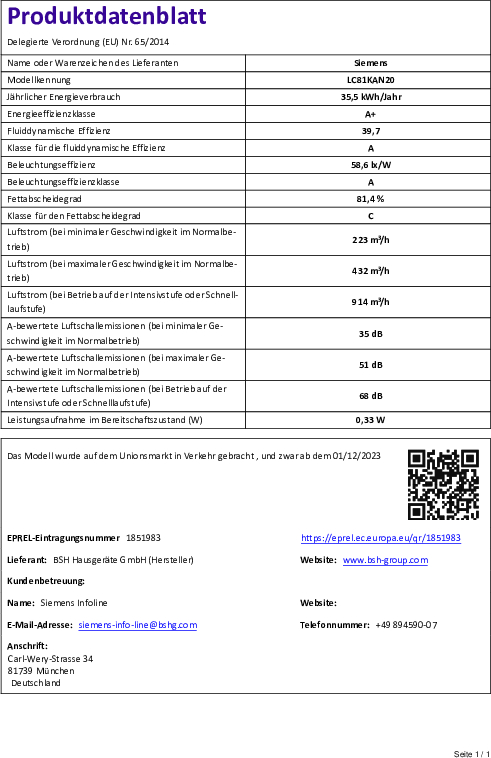• Leistungsstufe 1: Lüfterleistung 223 m3/h; Geräuschwert 35 dB(A)