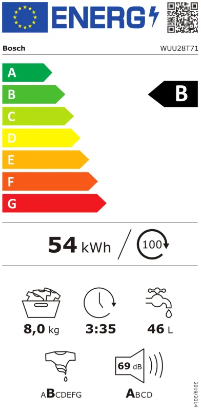 - Energieeffizienzklasse: B (54 kWh / 100 Zyklen, 46 l Wasser/Waschgang)